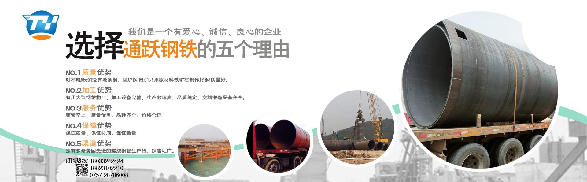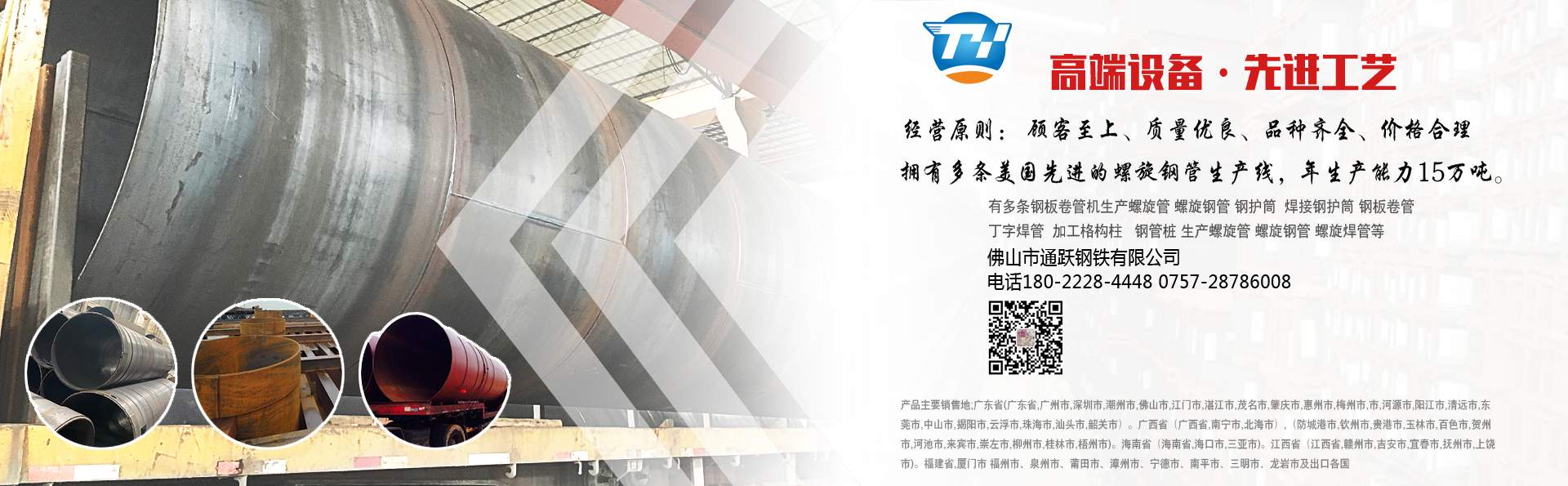 佛山市通躍鋼鐵有限公司 電話180-2228-4448 0757-28786008 擁有多條美國先進(jìn)的螺旋鋼管生產(chǎn)線,生產(chǎn)直徑φ159-φ3620mm(壁厚6mm-20mm)的雙面埋弧螺旋焊鋼管,年生產(chǎn)能力15萬噸。 生產(chǎn)螺旋管 螺旋鋼管 螺旋焊管 規(guī)格厚度6mm-20mm 直徑159mm-3620mm 有多條鋼板卷管機(jī)生產(chǎn)規(guī)格厚度6mm-70mm 直徑400mm-5020mm 螺旋管 螺旋鋼管 鋼護(hù)筒 焊接鋼護(hù)筒 鋼板卷管 丁字焊管  加工格構(gòu)柱 鋼管樁 材質(zhì)Q235B Q345B Q235A 45# 20# Q420D Q390··· ……